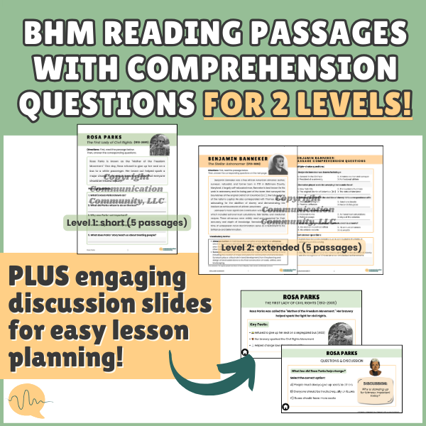 However, finding accessible, differentiated materials that are both historically rich and easy to implement can be a challenge. That’s why we created our Black History Month Reading Passages With Comprehension Questions & Lesson Slides, a no-prep resource designed for speech therapy, special education, and general classrooms.