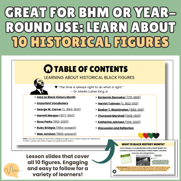 Our Black History Month Reading Passages & Lesson Slides provide information on 10 historical figures in addition to: