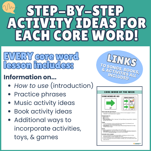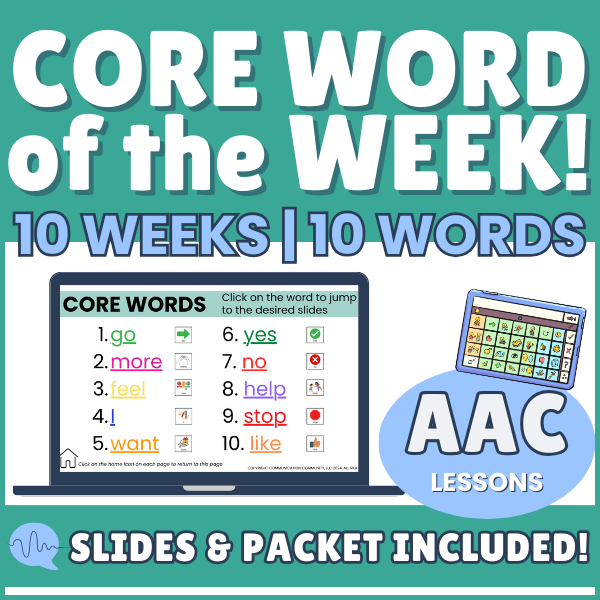 The “Core Word of the Week” approach is a common way to target core words in speech therapy sessions, in the classroom, and in other instructional environments. Using this approach, one core word is targeted multiple times over the course of the week to increase exposure to it and highlight how it can be used in different contexts.