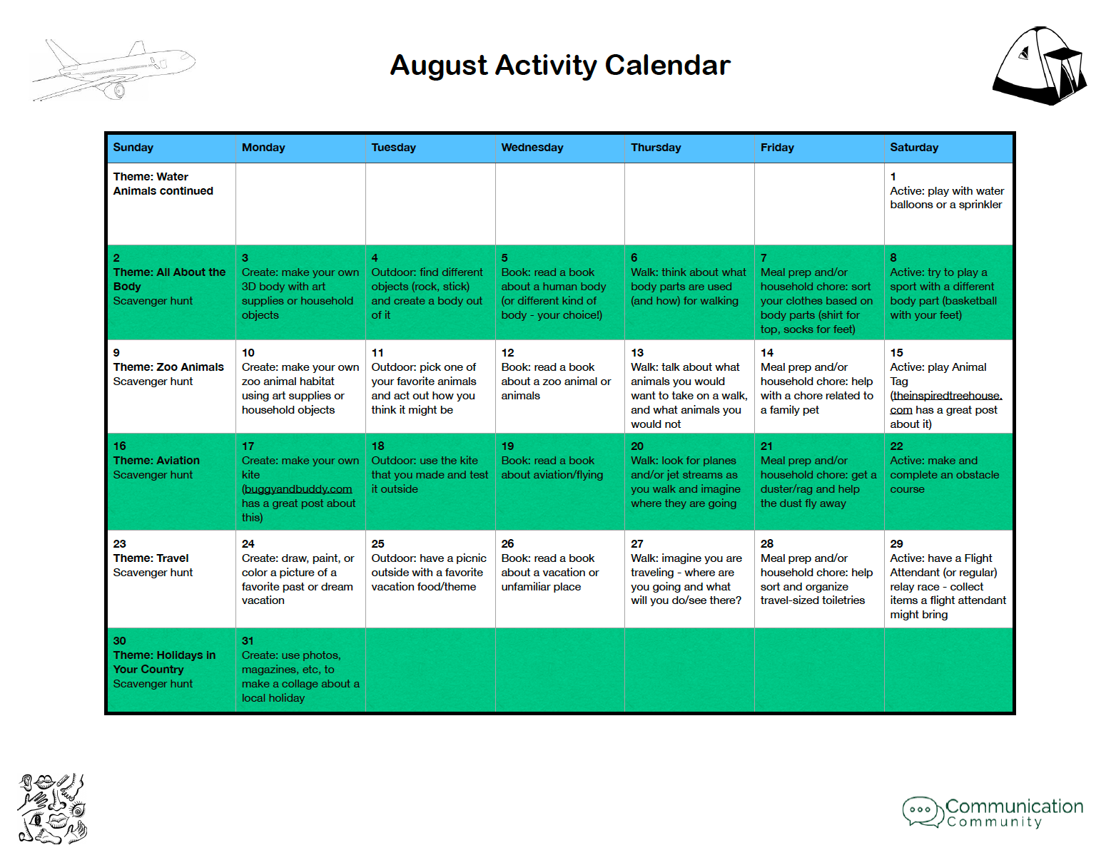 If you are looking for ways to continue to incorporate language and communication activities into your summer fun, or if you are trying to ramp it up a little more with the new school year starting soon, the August Calendar Activity is a great resource. As mentioned in the blog post with the June Calendar Activity, the purpose of this calendar is to provide ideas for facilitating language that are both manageable and flexible. Check out the box below with some information about child-centered language intervention, or check out the June Calendar Activity post, which provides a more in-depth overview of it.