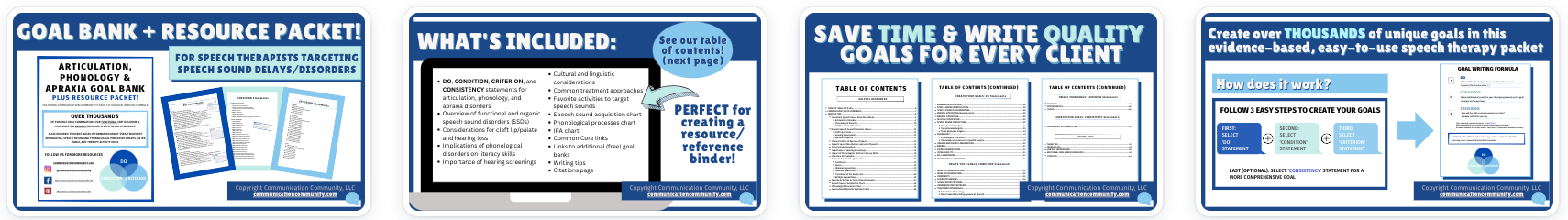 Your one-stop shop for the treatment of speech sound disorders (articulation, phonological, & apraxia) - a goal bank + resource packet COMBO! Create over THOUSANDS of unique goals in this evidence-based, easy-to-use speech therapy packet.