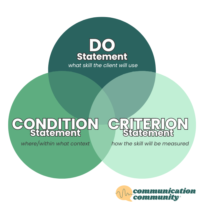 *Also commonly included is consistency (we incorporate this!). Aka does the individual have to meet a specific criterion more than once? A common example of this may include across 3 consecutive sessions. This is usually something understood by the therapy organization/service provider and is sometimes/sometimes not included in the written goal itself. This is to ensure that the skill has been generalized and provides more reliable data that the skill has been properly mastered.