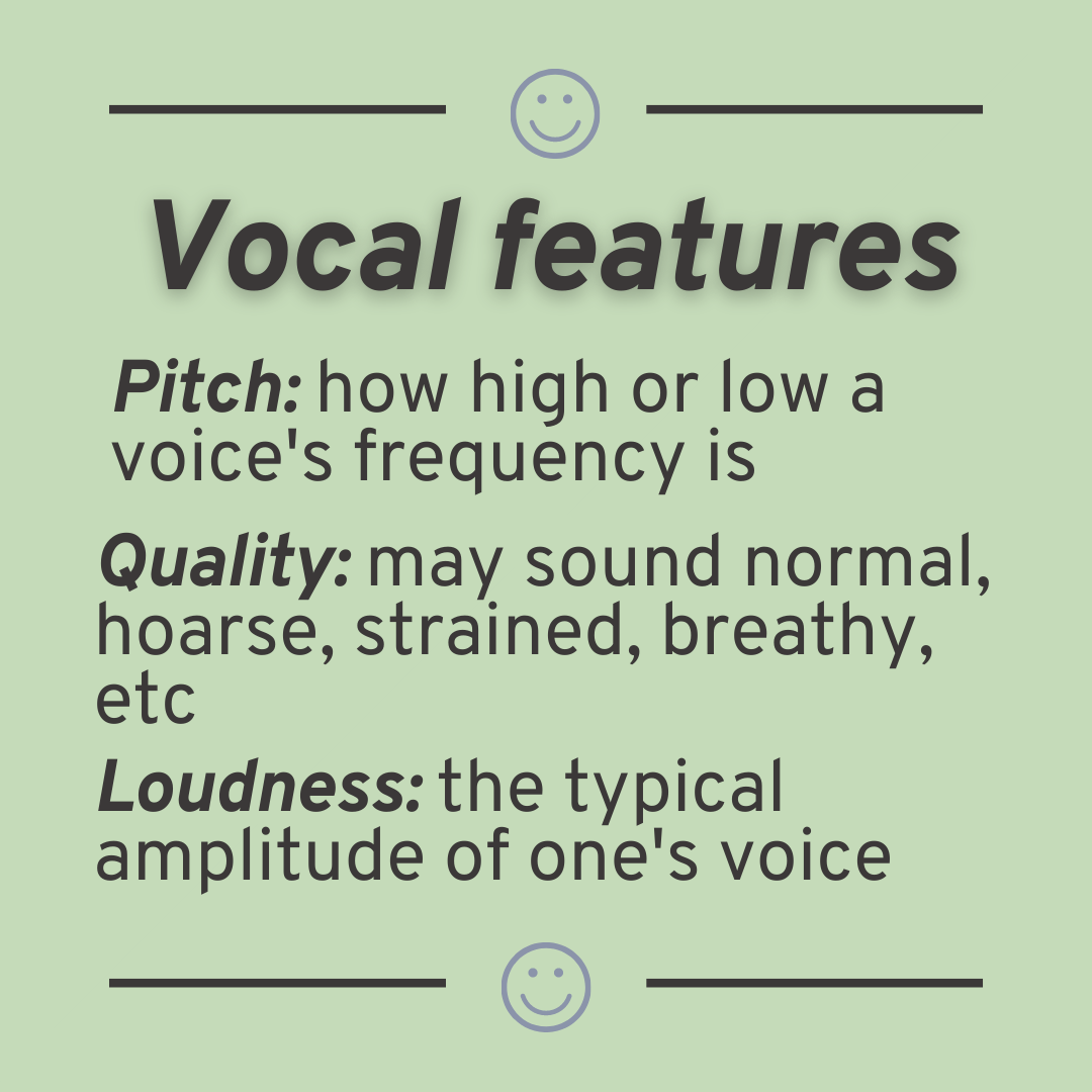 Pitch refers to the frequency, or how high or low, a voice sounds. Quality is how the voice can be perceived; e.g. is it “normal,” rough, breathy, etc. Amplitude, sometimes referred to as loudness, is the average loudness level of one’s voice.