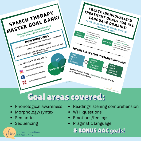 Each goal bank is adaptable and a great guide for helping you figure out what skill your client needs to focus on next... Just select your own combination of DO + CONDITION + CRITERION (and consistency) statements to develop personalized and measurable goals. Easy.