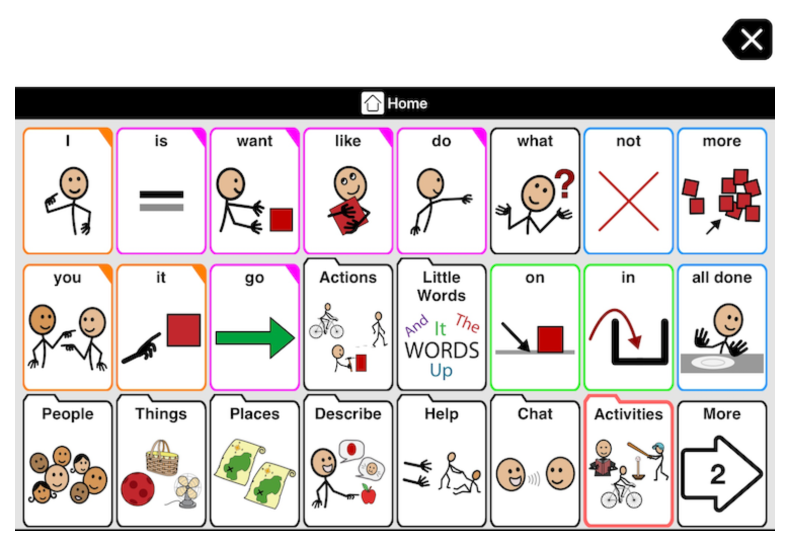 In this example, you can see that the folders include Things, Places, People, and Chat, among others. Vocabulary in these folders is often specific to the individual (e.g. fringe vocabulary is more specific to context). So “Things” may have some of their favorite objects/items and “People” may have members of their family, caregivers, friends, and community people (e.g. “doctor”, “barber”). A Things folder for me would likely have my phone, headphones, Kindle, whereas yours may have iPad, book, and ball. A People folder would include the name/pictures of people I see/talk to most often, and they are probably very different from the people you see/talk to most often. Other folders with fringe vocabulary may include Food/Drink (e.g. apple juice) or Needs (e.g. sunglasses, hearing aids, wheelchair, mask, wallet).