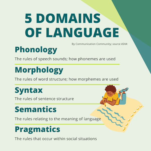 There are five domains of language: phonology, morphology, syntax, semantics, and pragmatics. Within each of the domains, someone can develop receptive skills (e.g. understanding vocabulary) and expressive skills (e.g. using correct grammar)