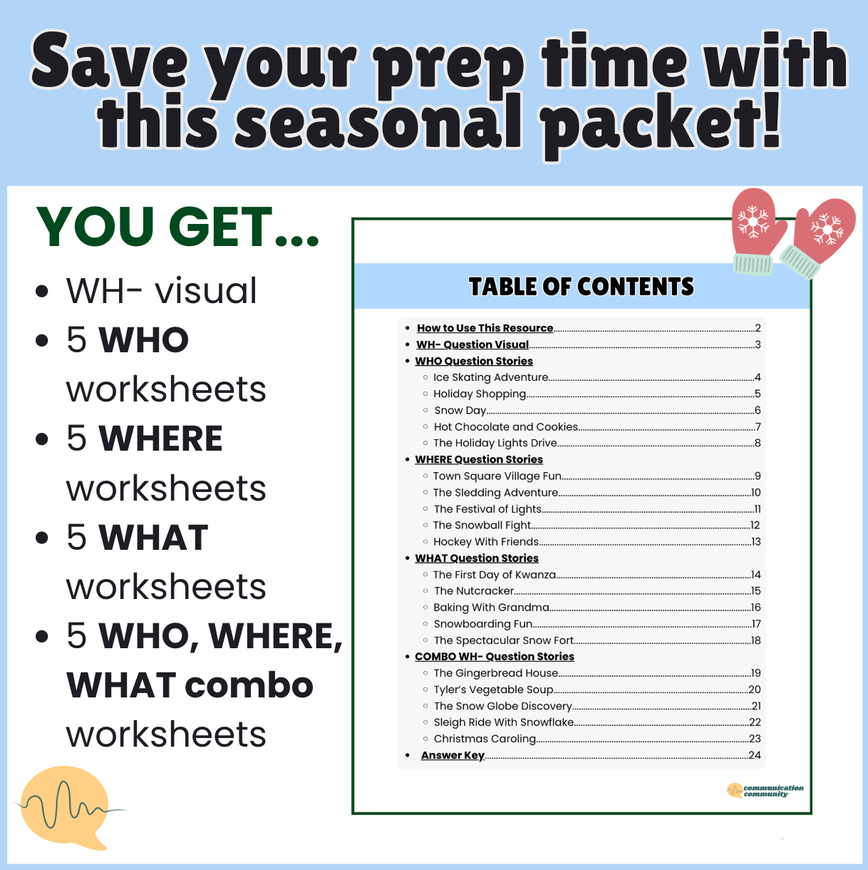 Finding winter-themed resources that are engaging and educational can be a challenge. Our Winter Short Stories with WH Comprehension Questions offers a ready-to-use solution, perfect for enhancing WH- question answering/understanding, reading comprehension, analyzing text, recalling details, summarizing information, and more...all while celebrating the season!